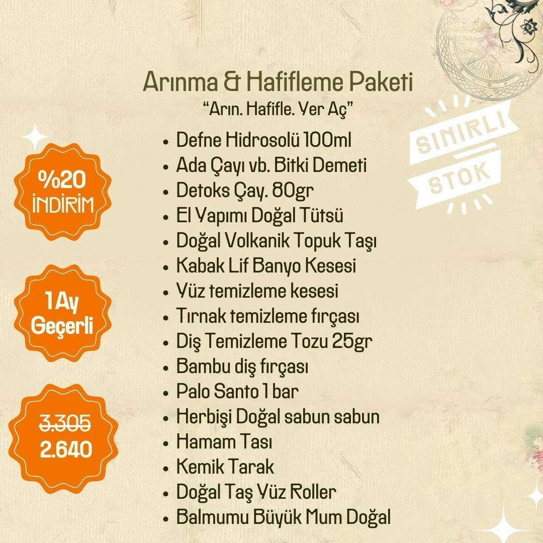 Yıllardır toprağın bilgisinden, bitkilerin arındırıcı gücünden ve el emeğinin sadeliğinden besleniyoruz. Arınma & Hafifleme Paketi, bedeni, zihni ve yaşam alanını nazikçe temizlemeye; yavaşlamaya ve hafiflemeye eşlik etsin diye bir araya getirildi.