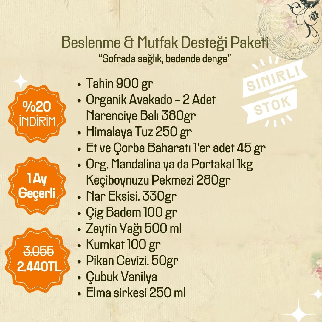 Sağlıklı Beslenme & Mutfak Desteği Paketi, mutfağını sadeleştirmek, sofrana gerçek gıdayı taşımak ve bedeni içeriden desteklemek isteyenler için hazırlandı.
